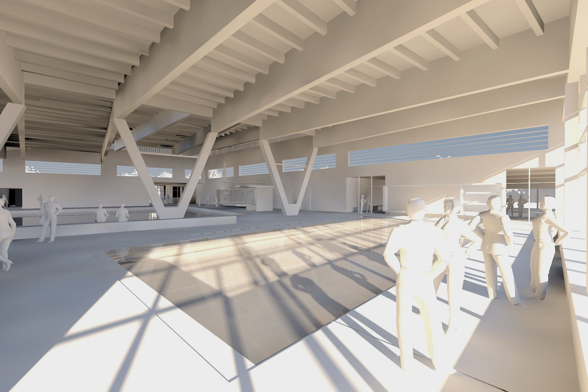 Der eingeschossige massive Rücken des Gebäudes, der die Funktionsräume, Umkleiden und Verwaltung des Hallenbades enthält, bildet eine nach Norden und Westen klare Raumkante zur Stadt hin. An der Ost- und Südseite öffnet sich die Schwimmhalle über raumhohe Glasflächen zum Freigelände und gibt den uneingeschränkten Blick auf die Badelandschaft frei; der Übergang zwischen innen und außen wird fließend.