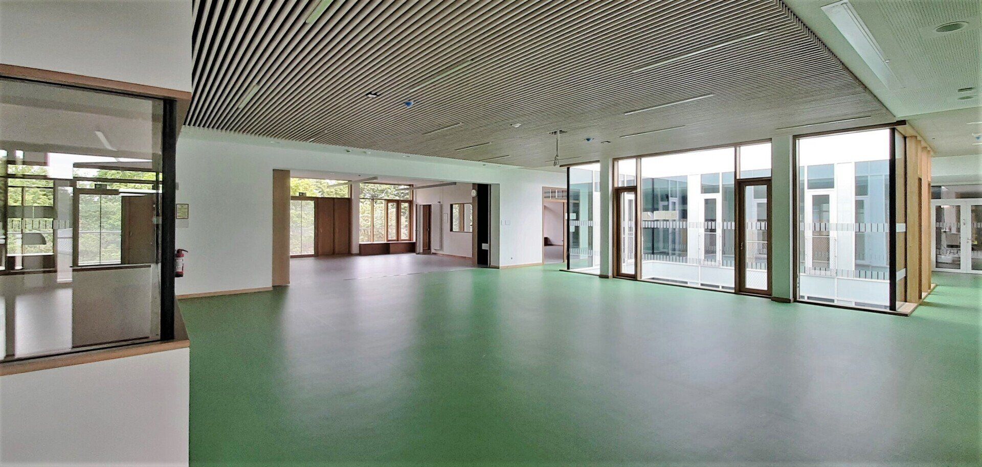 Die horizontale Gliederung und die kontrastreiche Materialwahl sorgen für eine den Kindern angemessene Maßstäblichkeit des großen Volumens.
