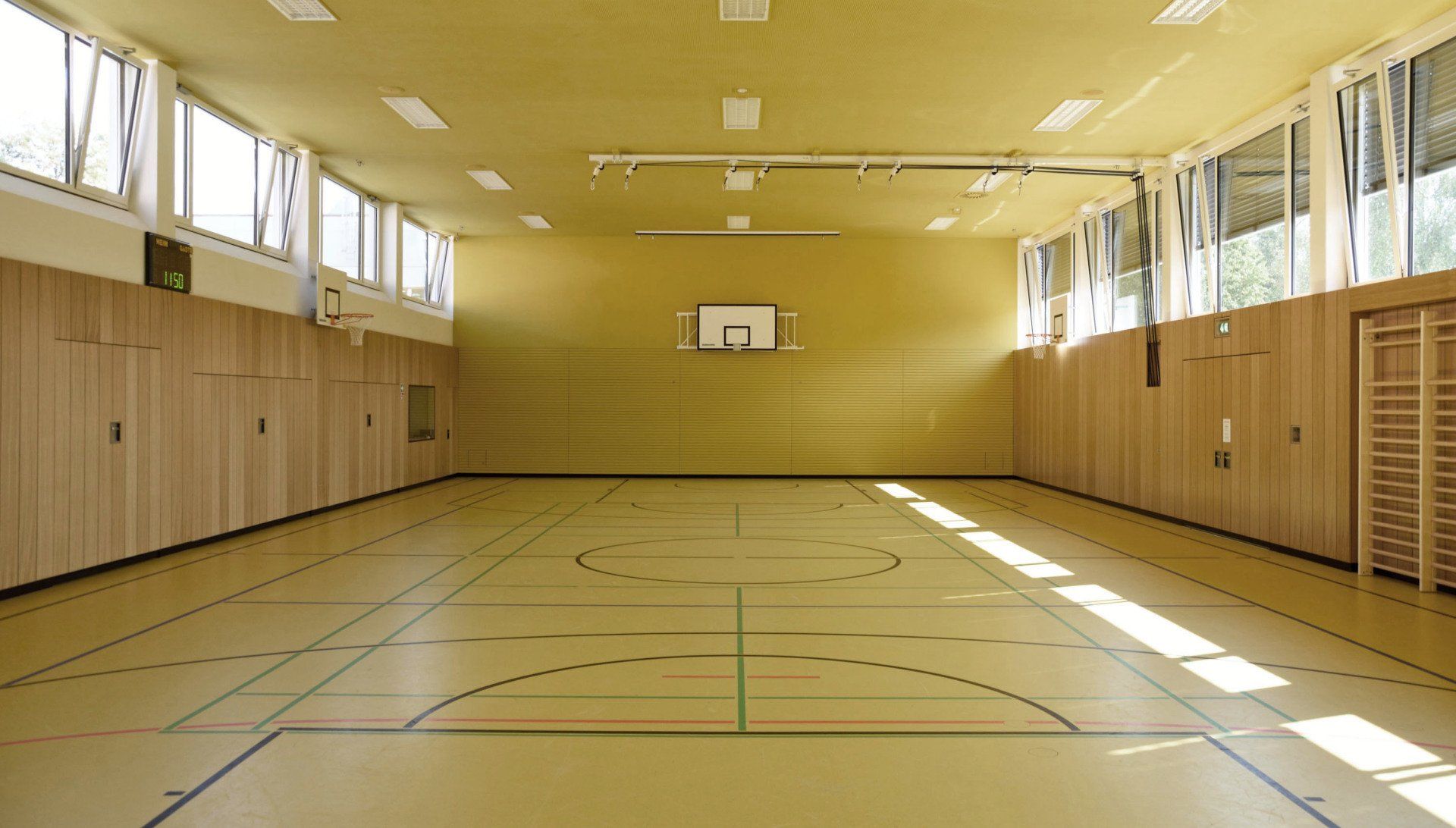 Die Erweiterungen, wurden aus statischen Gründen in Holz-Beton oder Holzbauweise errichtet. Ein durchgehendes Fassadenkonzept aus einfachen Putzfassaden (Sanierung) und hinterlüfteten Plattenfassaden (Neubau und Erweiterungen) gliedern die Baumassen und verbinden die unterschiedlichen Bauabschnitte zu einem ganzheitlichen Schulensemble. Die Holz-Beton-Verbunddecken wurden in den Klassenräumen mit akustischer Unterseite ausgeführt - ohne zusätzliche abgehängte Decken. Die Installationsführung wurde entsprechend intensiv abgestimmt. Mit den Brettsperrholzwänden an den Stirnseiten und einer farbigen Flurwand erhalten die Unterrichtsräume eine angenehme Atmosphäre. Jedes Stockwerk wurde mit einer Leitfarbe für Böden, Türen, Wände und Möbel versehen. So zieht sich ein farbiges Band, das die Orientierung erleichtert, durch das komplexe Gebäude.